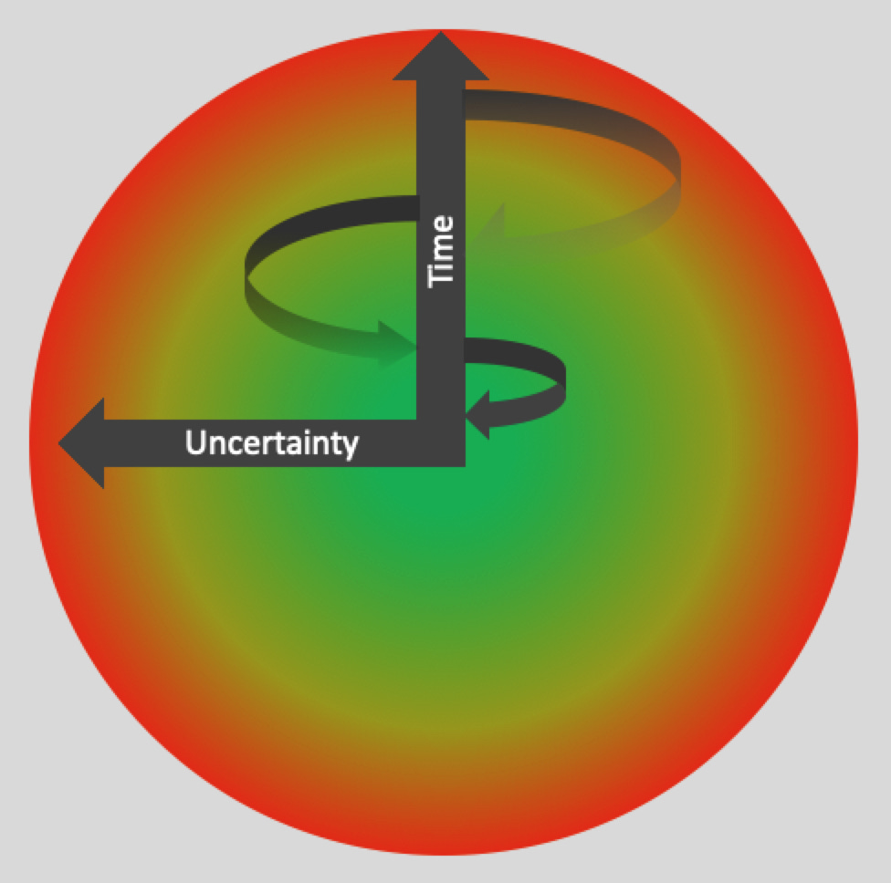 Information and correlations between information (hence just information) is stored in the brain in networks of connected neurons. At any one time, we will have a core of information we feel certain about (illustrated by the green colour in the figure above) that is bounded by information that becomes increasingly uncertain. As activity spreads through these networks (illustrated by the time arrow) two features should emerge. Firstly, more networks and the information they represent will be connected, which may improve cognitive output. Secondly, the probably of uncertain information being activated will be increased. This may lead to novel connections, but it will also be experienced as negative and therefore inhibit further cognition. In other words, cognition involves a time-lag between the initiation of an instance of thought and its completion where novel insights may emerge but this will be experienced as negative; and in fact, its completion may be driven by the negative experience rather than a functional conclusion. Equally, though, the negative experience has a functional role in signalling there is insufficient understanding. Therefore, there is a subtle relationship between thinking and feeling.